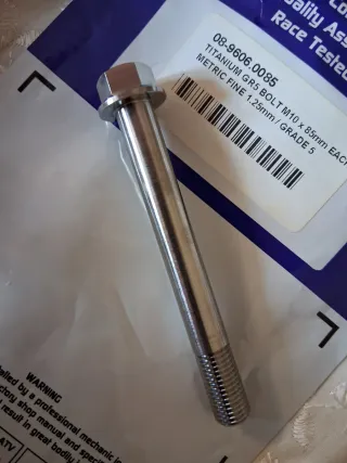 Parafuso de titânio GR5, com rosca métrica fina. - Material: Titânio GR5 - Medida: M10 x 85mm - Passo da rosca: 1.25mm - Classe: 5 - Fabricado na Grã-Bretanha