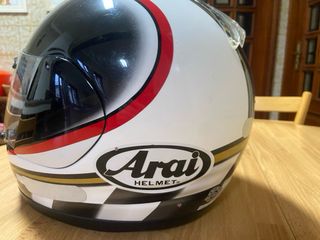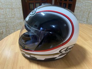 Capacete Arai Condor em bom estado. - Design com detalhes em preto, branco e vermelho. - Viseira transparente. - Logotipo Arai visível.