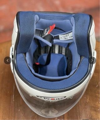 Capacete estilo jet da marca Suomy, em branco com detalhes prateados. - Design moderno e leve. - Viseira transparente. - Fecho de segurança.