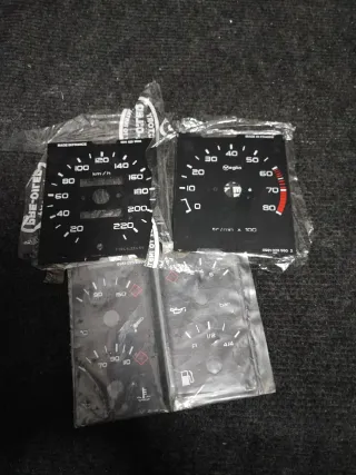 Vendo dois fundos completos para o conta quilómetros para Peugeot 205 GTI original, nunca usado - Painel de velocímetro (km/h). - Painel de conta-rotações (tr/min x 100). - Painel de temperatura (°C). - Painel de nível de combustível e pressão do óleo (bar). - Fabricado em França. ( São dois conjuntos ) Itens bastante raros de arranjar.