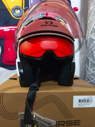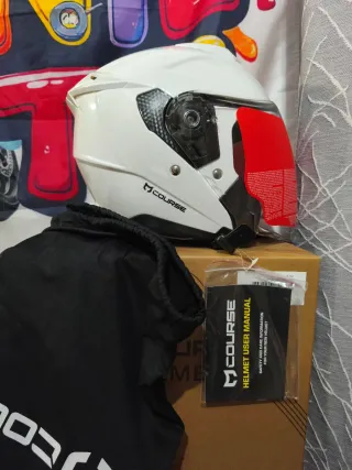 Capacete de moto da marca COURSE, cor branca. Inclui viseira escura - Inclui saco de proteção. - Inclui manual do utilizador.