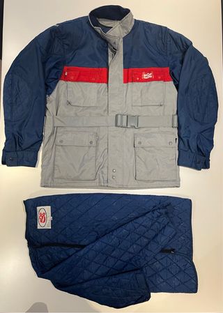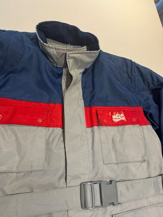 casaco de motociclismo MQP. - Casaco com fecho frontal e cinto. - Detalhes em azul, cinza e vermelho. - forro de inverno