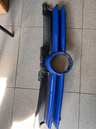 Grelha frontal original para VW Golf 4 IV. - Cor azul. - Design com frisos verticais e detalhe circular central.