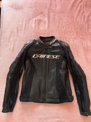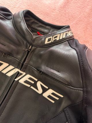 Casaco de mota Dainese em pele, preto com letras em branco. Modelo de mulher no tamanho 40. Em ótimo estado de conservação. Preço negociável. - Pele de alta qualidade; - Design desportivo; - Fecho frontal; - 2 bolsos laterais; - 1 bolso no interior; - Entradas de ar a frente e a trás; - Ajuste na cintura; - Proteções de ótima qualidade nos ombros, cotovelos e braços.
