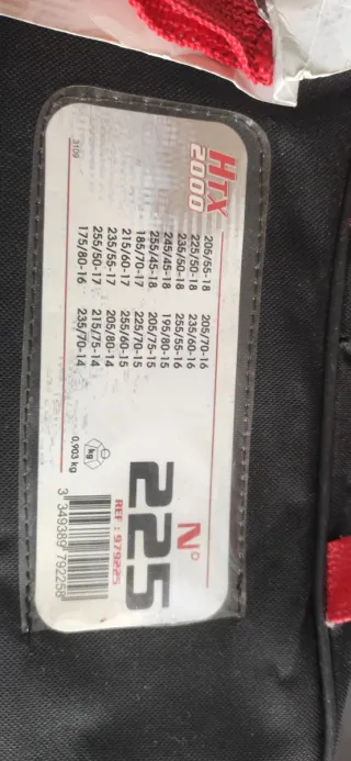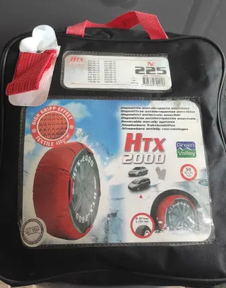 Correntes têxteis para pneus, modelo HTX 2000, tamanho 225. Inclui bolsa para arrumação. Novas, nunca usadas - Correntes de neve para pneus. - Modelo HTX 2000. - Tamanho 225, para várias dimensões de jante (14 a 18) - Inclui bolsa de transporte. - Material têxtil. - Peso: 450gr/m². - Velocidade máxima: 50 Km/h.