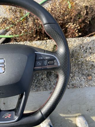 Volante desportivo para Seat Leon FR modelo 5F. - Design desportivo com costura vermelha. - Acabamento em pele perfurada. - Emblema FR na parte inferior. - Muito bom estado apenas com alguns arranhões pouco visíveis, ver fotos