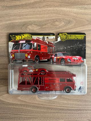 Conjunto Hot Wheels Team Transport com o icónico Ferrari 250 GTO. Embalagem ligeiramente danificada - Inclui um camião de transporte e um carro desportivo. - Detalhes em vermelho metálico.