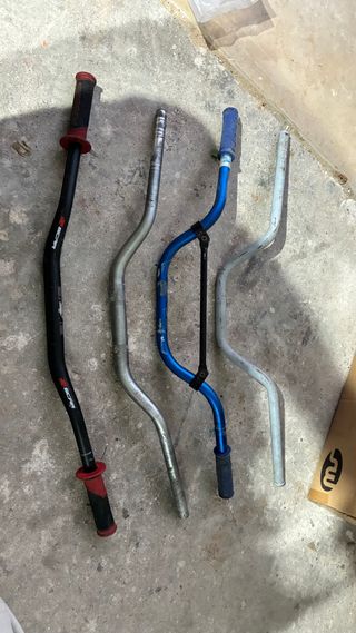 Conjunto de quatro guiadores para mota ou bicicleta. - Guiador preto com punhos vermelhos e pretos. - Guiador origem yamaha banshee - Guiador azul com barra de reforço. - Guiador prateado claro.