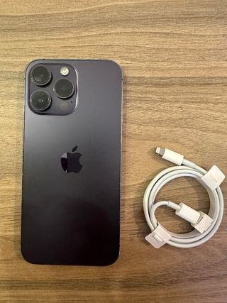 iPhone 14 Pro Max em excelente estado, com design elegante e acabamento premium. - Cor: Preto/Roxo - Inclui cabo de carregamento.