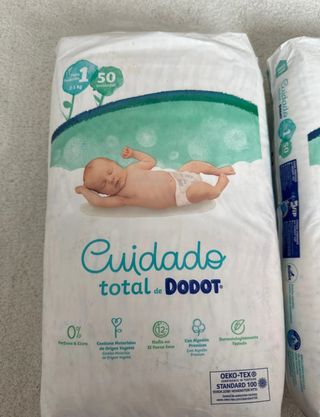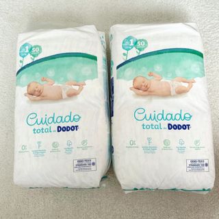 2 Pacotes de fraldas Dodot, tamanho 1, para bebés entre 2 e 5 kg. - total 100 fraldas (2x50). - Sem perfume e sem cloro. - Com materiais de origem vegetal. - Dermatologicamente testado.