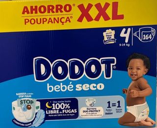 Caixa de Dodot Bebé Seco tamanho 4 - 164 unidades. - Peso recomendado: 9-14 kg. - Barrera Stop Fugas. - Cobertura suave. - Duplo sistema de proteção nas pernas.