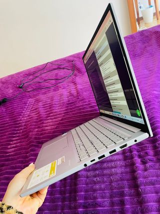 Portátil ASUS Vivobook em acabamento prateado. Processador: Intel Core i5 • Gráficos: Intel Iris Xe (ótimo para trabalho, estudos e uso diário) • Tela: Aproximadamente 15,6” • Teclado: Layout europeu (PT/ES) • Leitor de impressão digital (fingerprint) • Conectividade: HDMI, Wi-Fi • Design: Slim, moderno, cor clara (silver/cream) • Estado físico: • Muito bem conservado • Pequenos sinais estéticos normais de uso • Tela íntegra • Teclado e touchpad em ótimo estado