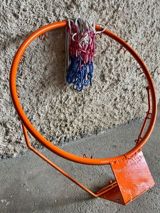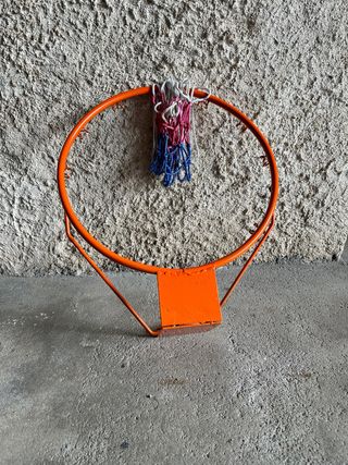 Aro de basquetebol em cor laranja, com rede incluída. - Aro em metal. - Oferta de rede com fios em branco, rosa e azul.