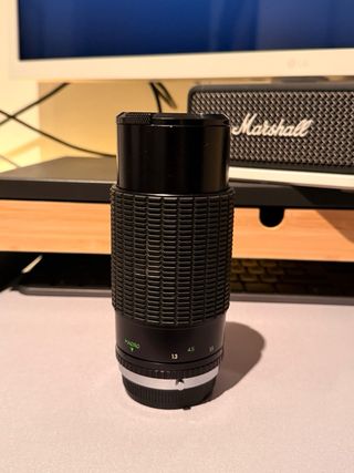 Lente teleobjetiva vintage com mount Olympus OM. - Design clássico e robusto. - Foco manual. - Escalas de distância e abertura visíveis.