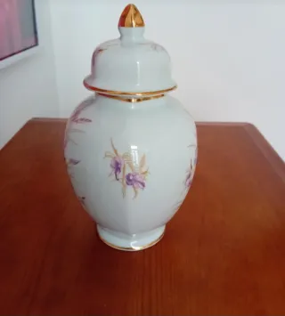 Pote de porcelana Limoges com um delicado padrão floral. - Detalhes em dourado. - Flores em tons de rosa e roxo. - Acabamento em porcelana de alta qualidade.