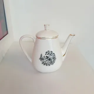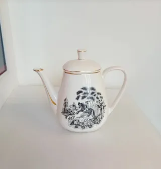 Bule em cerâmica da marca Sacavém com um design clássico e elegante. Apresenta uma pintura detalhada em preto e branco com motivos florais e uma cena campestre com um cavaleiro. - Acabamento em branco com detalhes dourados. - Padrão de paisagem com cavaleiro e arquitetura. - Bico e asa curvos.