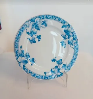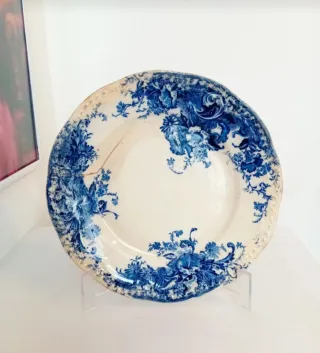 Prato antigo da marca Sacavém, com o padrão Togo em azul e branco. Uma peça decorativa com um design floral clássico. - Padrão floral Togo. - Cor azul e branca. - Borda rendilhada.