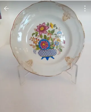 Prato decorativo com padrão floral. - Design floral colorido no centro. - Borda com detalhes dourados. - Acabamento em branco brilhante.