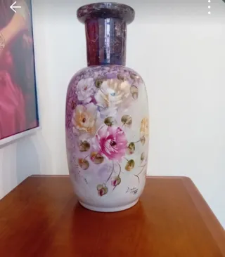 Jarra de porcelana com um belo design pintado à mão. - Motivo floral com rosas. - Detalhes em tons de roxo e rosa. - Acabamento brilhante.