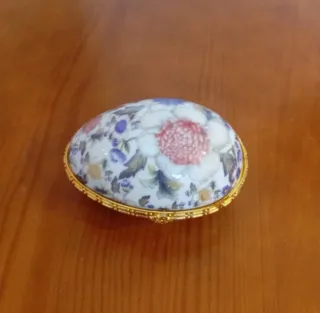 Linda caixa em formato de ovo, perfeita para guardar pequenas joias ou objetos. A peça é ricamente decorada com um delicado padrão floral. - Design em formato de ovo. - Acabamento com detalhes dourados na borda.