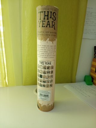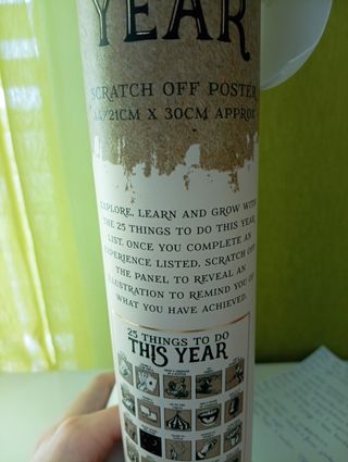 "Poster de atividades para este ano! Um poster para riscar com 25 coisas para fazer este ano. - Inclui 25 atividades para completar. - Formato A4 (21cm x 30cm). - Design vintage e ilustrações divertidas. - Ótimo para organizar seus objetivos anuais." Não utilizado e completo, mas a tampa tem duas pequenas partes partidas.