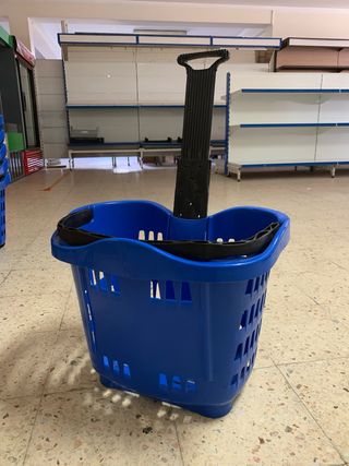 Cesto de supermercado de plástico azul com rodas. -6 cestos - Rodas resistentes para um transporte cómodo. (Preço negociável)
