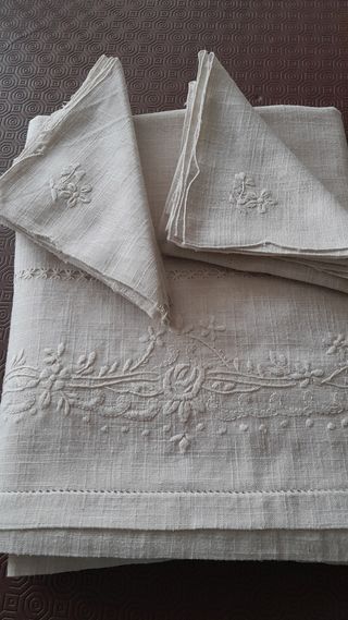 Toalha em linho com bordado com 10 guardanapos, 2,5m x 1,70m. Nunca foi usada.