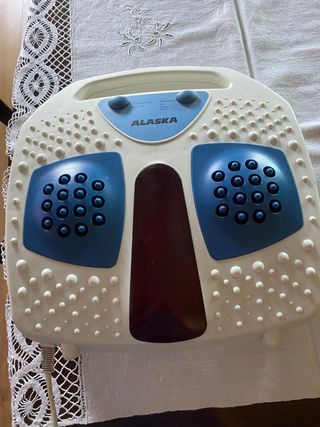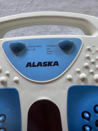 Massajador de pés elétrico da marca Alaska. Possui uma superfície com relevos para massagem e botões de controlo. Com duas velocidades -Lâmpada de infra vermelhos - Design branco e azul.