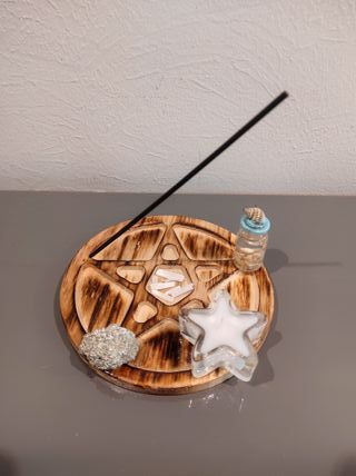 Pentagrama - Representa os 5 elementos da Natureza (foto n. 1): Ar, Terra, Fogo Água e Espírito. 📌 Tabuleiro em madeira c) forma de Pentagrama - 15 x 15 cm 📌 Incensos Aroma + Cristal da Scents - Cx c/ 8 Hastes + Cristais de Selenite 📌 Pirite - 39 gr. Aprox. 📌 Vela em forma de ⭐ 📌 Recipiente em vidro c/ Búzio, Areia e Água do Mar
