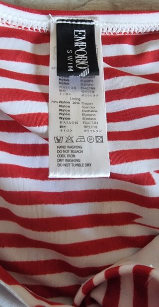 Biquini Emporio Armani, tamanho M, em excelente estado. - Padrão listrada vermelho e branco com estrelas brancas. - Tecido: 82% nylon, 18% elastano. - Forro: 74% nylon, 26% elastano. - Lavagem à mão, não usar lixívia, passar a ferro frio, não lavar a seco.