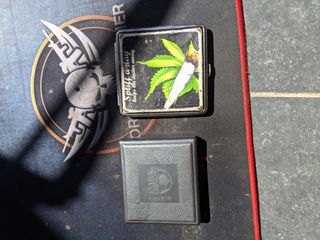 Duas carteiras de tabaco antigas. Uma com um design de folha de cannabis e a outra mais clássica e discreta. Ambas em bom estado, mostrando sinais normais de uso. - Carteira 1: Design de folha de cannabis e baseado em tons escuros. - Carteira 2: Design mais sóbrio e elegante, em tons escuros.