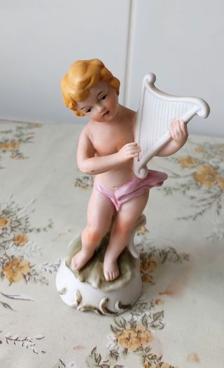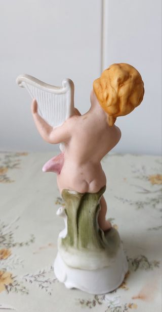 Linda figura de porcelana de um menino a tocar harpa. Uma peça delicada para decorar. - Detalhes pintados à mão. - Base decorativa.