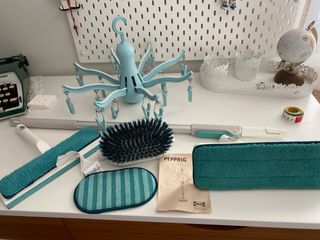 Conjunto de materiais de limpeza da IKEA, modelo Pepprig. -Secador suspenso de polvo Ikea - Escova de limpeza. - Esfregão com cabo extensível. - Pano de limpeza extra - Raspa e limpa vidros