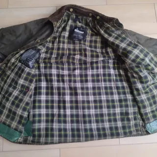 Casaco vintage Barbour modelo Beaufort, ideal para quem procura um projeto de restauro, pois tem vários remendos e furos. Casaco ideal para a caça, conhecido pelo seu bolso traseiro de grande capacidade. - Tecido encerado. - Gola em veludo cotelê. - Forro xadrez. - Bolsos frontais com botões.