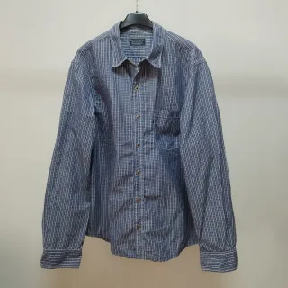 Camisa de manga comprida com um padrão de riscas finas em azul e branco. Possui um bolso no peito e fecho de botões. - Padrão de riscas finas - Bolso no peito - Fecho de botões