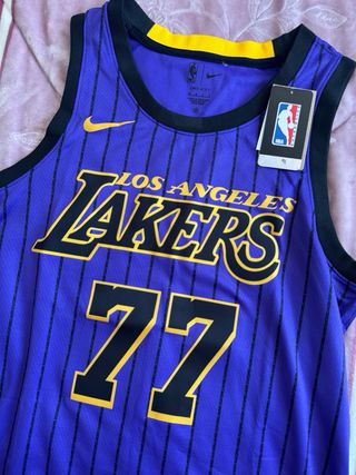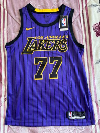 Camisola dos Los Angeles Lakers, número 77. - Cor principal roxa com detalhes em dourado e preto. - Design com riscas verticais pretas. - Logo da Nike e da NBA visíveis.