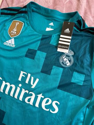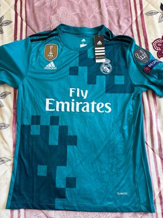 Camisola do Real Madrid da época 2017/18, usada por Cristiano Ronaldo. - Cor verde-água com detalhes em azul escuro. - Logo da Adidas e escudo do Real Madrid. - Patch da FIFA Champions League e da UEFA. - Patrocínio Fly Emirates no peito. - Tecnologia Climacool para ventilação.