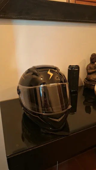 Capacete preto com detalhes dourados em forma de raio. - Tamanho L - Marca Axk