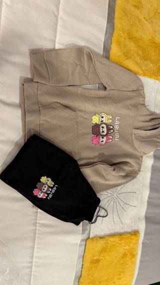 Conjunto de fato de treino para criança com estampa divertida. - Cor bege e preta. - Estampa com personagens Labubu. - Inclui camisola com capuz e calças.