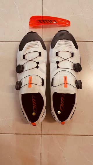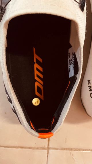 Sapatos de ciclismo DMT em branco e preto. - Fecho com sistema de discos. - Detalhes em laranja. - Tamanho 45.