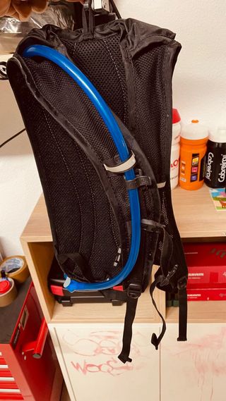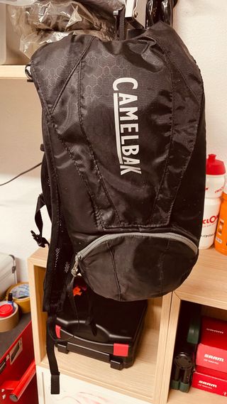 Mochila preta da marca Camelbak, ideal para atividades ao ar livre. - Design moderno com padrão hexagonal. - Bolso frontal com fecho. - Alças ajustáveis e acolchoadas. -kit d limpeza ótimo para btt ou Gravel