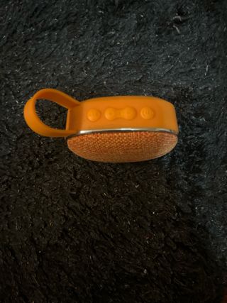 Coluna portátil com um design moderno e acabamento em tecido. - Cor laranja vibrante. - Alça para transporte. - Estrutura em metal.