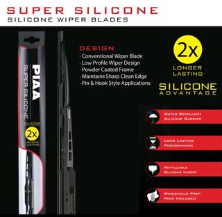 Conjunto de limpiaparabrisas PIAA Super Silicone. - Diseño de perfil bajo. - Marco con recubrimiento en polvo. - Mantiene un filo de limpieza nítido. - Aplicaciones de tipo Pin & Hook. - Barrera de silicona repelente al agua. - Rendimiento duradero. - Inserto de silicona recargable. - Incluye paquete de preparación para parabrisas.