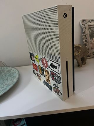 Consola Xbox One S com 1TB de armazenamento. - Cor branca e preta. - Design moderno e compacto. pequena racha na carcaça mas funciona a 100% apenas a consola, caixa e cabo de alimentação é o jogo também