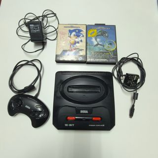 Consola Sega Mega Drive 2 com dois jogos clássicos. - Inclui os jogos Sonic e Ecco The Dolphin. - Console na cor preta. - Inclui comando e fonte de alimentação.