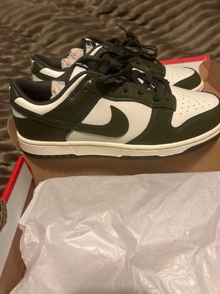 Sapatilhas Nike Dunk em verde escuro e branco. - Design clássico. - Cadarços pretos. - Detalhes perfurados na biqueira.