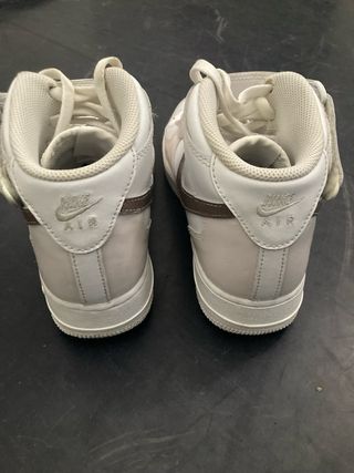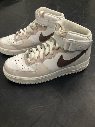 Tênis Nike Air Force 1 Mid em tons beje claro e marrom. Comprados na loja por 250€. - Fechamento com cadarço e velcro no tornozelo.