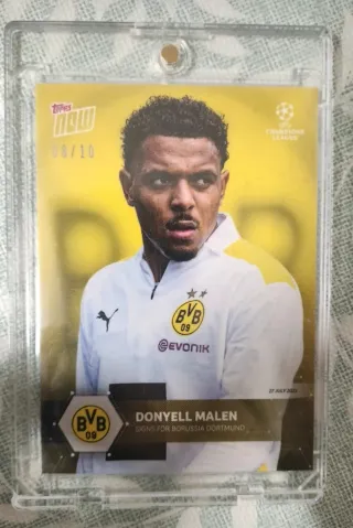 Vende-se carta colecionável Topps Now do jogador Donyell Malen, celebrando a sua contratação pelo Borussia Dortmund. Estado: Excelente/Mint (sempre mantida em capa protetora One-Touch). Raridade: Edição Limitada e Numerada 08/10 (Apenas 10 exemplares no mundo com este design paralelo!). Detalhes: Inclui o selo oficial da UEFA Champions League e a data de 27 de julho de 2021. Proteção: Segue devidamente protegida para garantir que chega em perfeitas condições. Ideal para colecionadores de cartões de futebol (Trading Cards) ou fãs da Bundesliga. Aproveita esta oportunidade de ter uma peça rara na tua coleção!