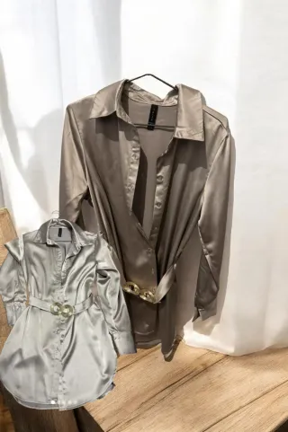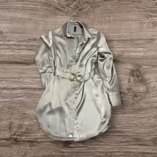 Vestido elegante com um brilho acetinado, perfeito para ocasiões especiais. Apresenta um design moderno e sofisticado. - Fecho de botões frontal. - Cinto com fivela dourada para acentuar a silhueta. - Mangas compridas com punhos abotoados. - Tecido com um acabamento lustroso.