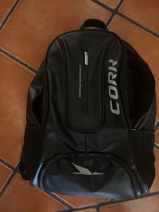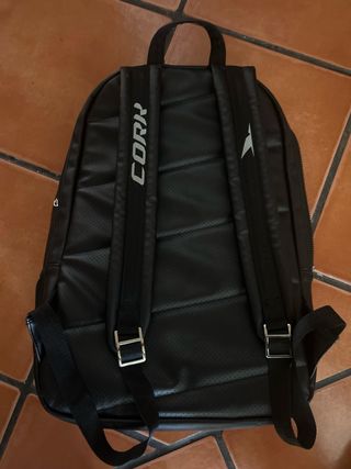 Mochila preta da marca Cork, ideal para transportar o seu equipamento de padel. Possui um design moderno e prático. - Material sintético de alta qualidade. - Compartimento principal espaçoso. - Bolsos laterais para acessórios. - Logotipo da marca em destaque.
